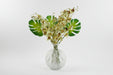 These artificial flower arrangements come with the vases a complete pack of everything you need to create the display shown in our photos. When arranged as we have it shown in our photos this measures 65cm x 55cm x 55cm. Stems are wired and this can be shaped to your requirements. This pack contains the following 1 x 26cm clear fern print glass bottle vase 26cm x 22cm x 22cm at widest points. The narrower top rim measures 9cm diameter. 6 x 80cm cream artificial mini orchid stem with ten flowers. 3 x 55cm single artificial monstera leaf. Flowers and foliage are supplied loose at full length ready for you arrange. You can cut these shorter if wanted for arrangement (very easy- just use wire cutters) or you can just fold the stems at the ends before putting them in the vase