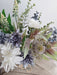 Featuring blue and white dahlias paired with eucalyptus and lush greenery, this handcrafted arrangement adds colour and texture without the need for upkeep. Presented in a textured glass vase with rustic detailing, it offers an easy, ready-to-style decorative touch.